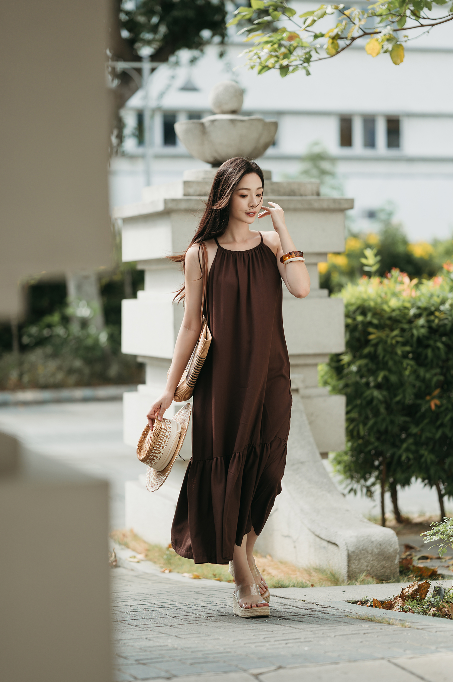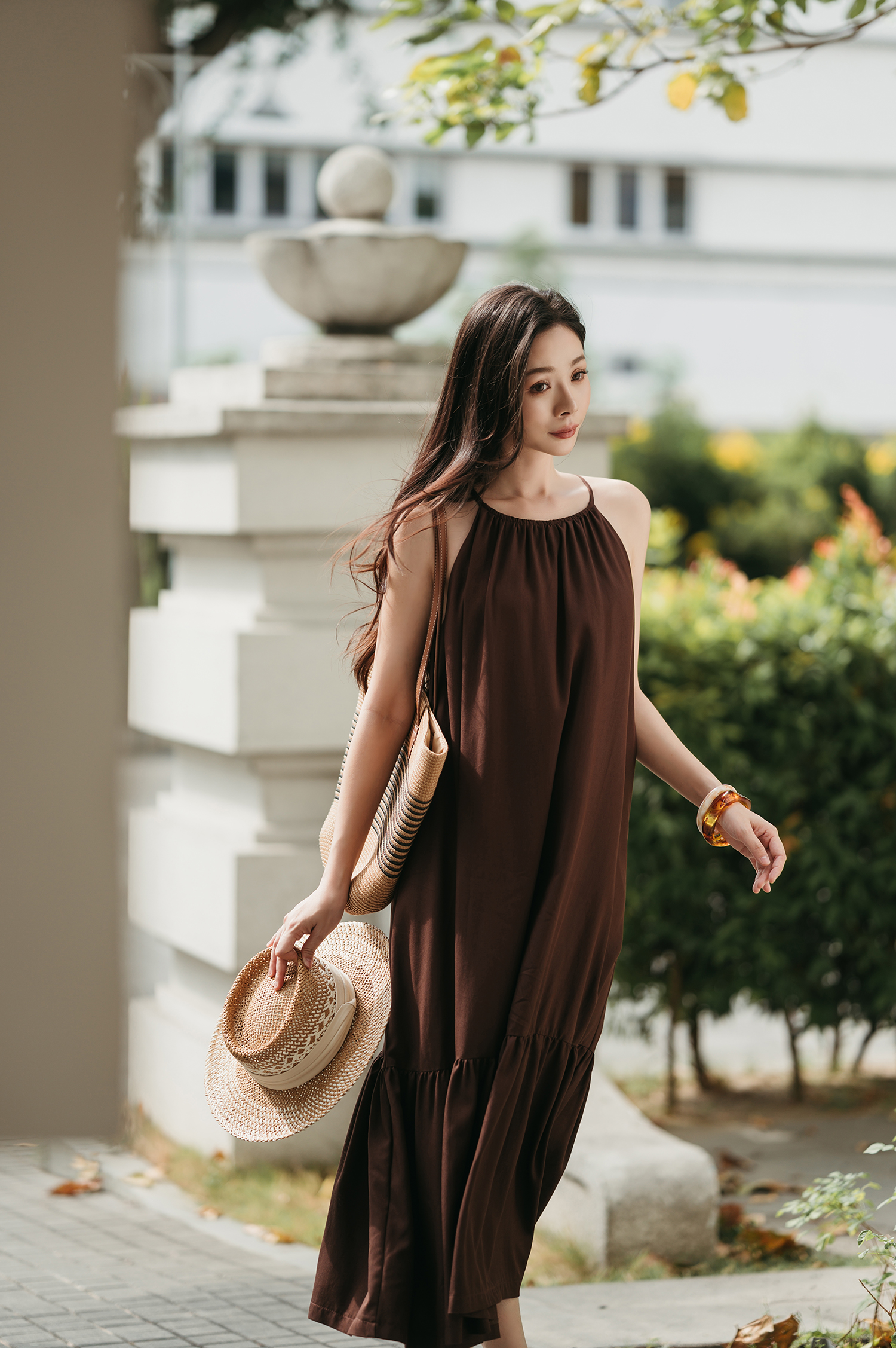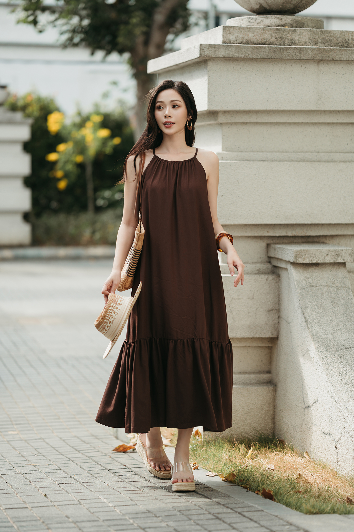 IDALIA HALTER NECK TIERED DRESS (BROWN)
