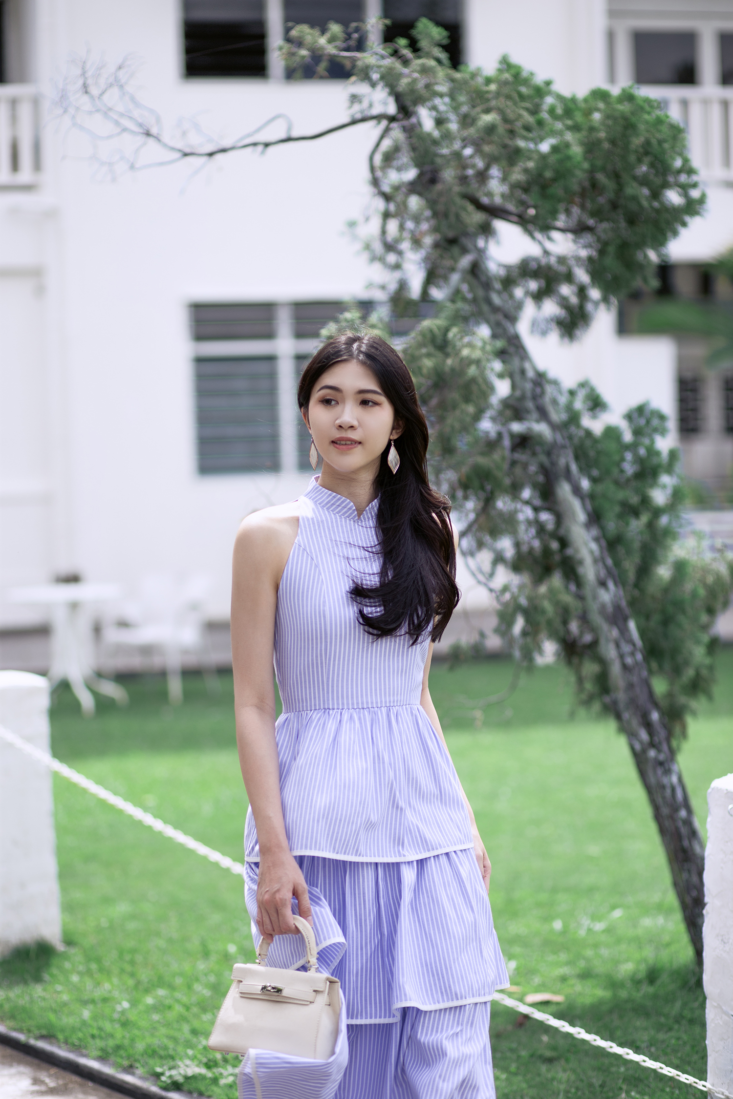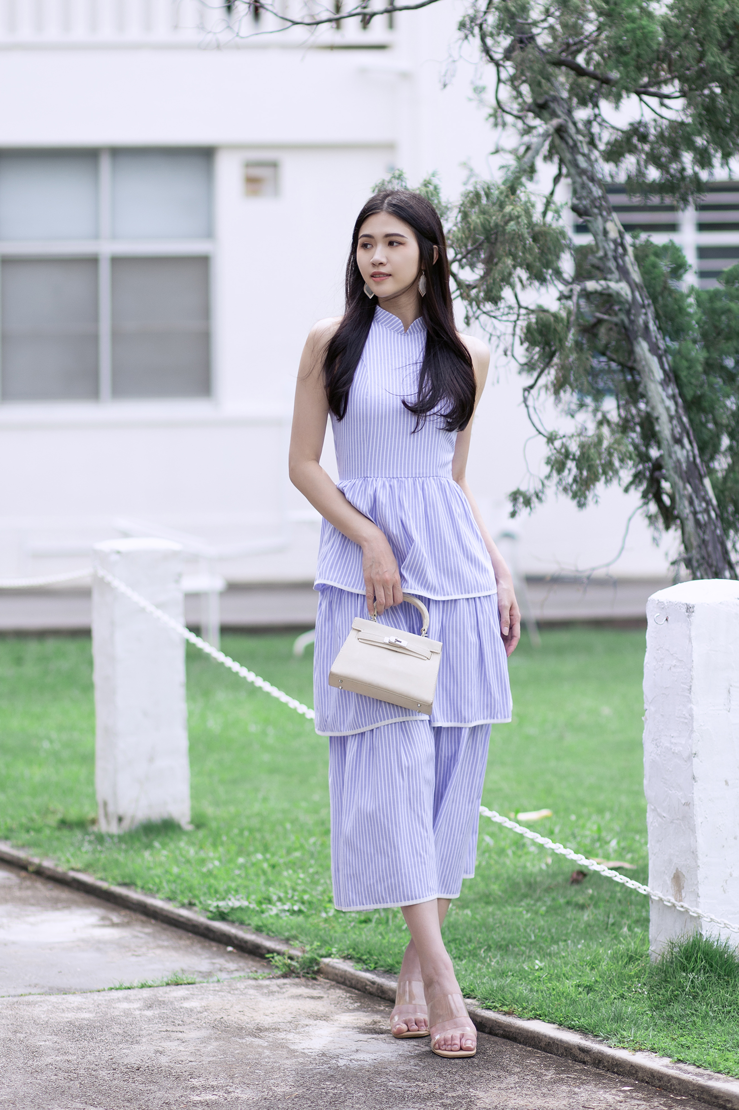 KACY MANDARIN COLLAR TIERED DRESS (BLUE STRIPE)