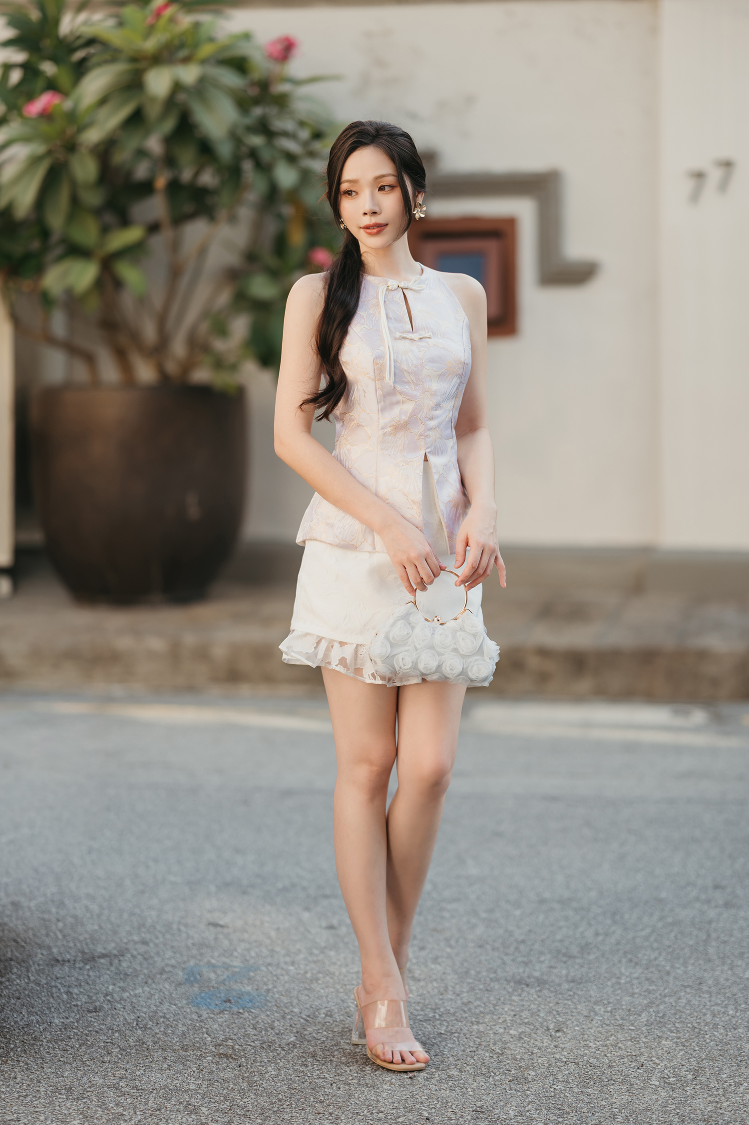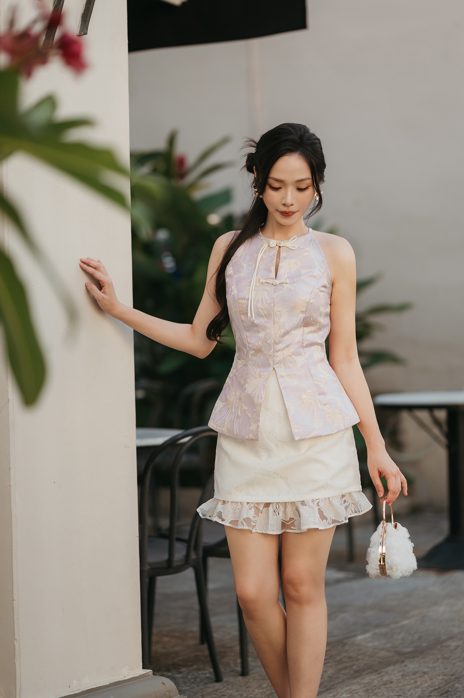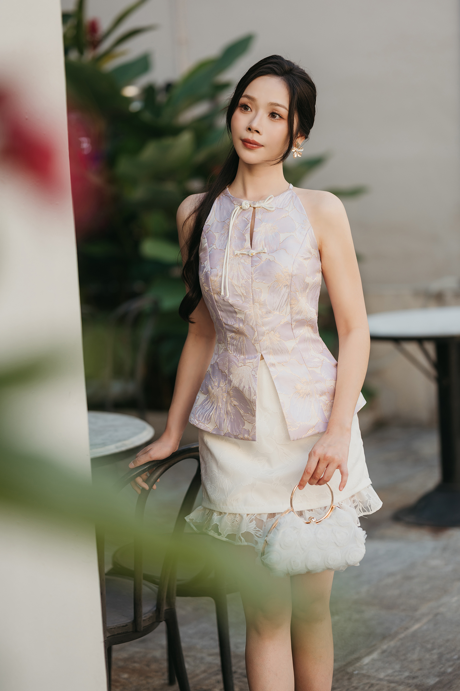 - - Features halter neckline with chinese button knot